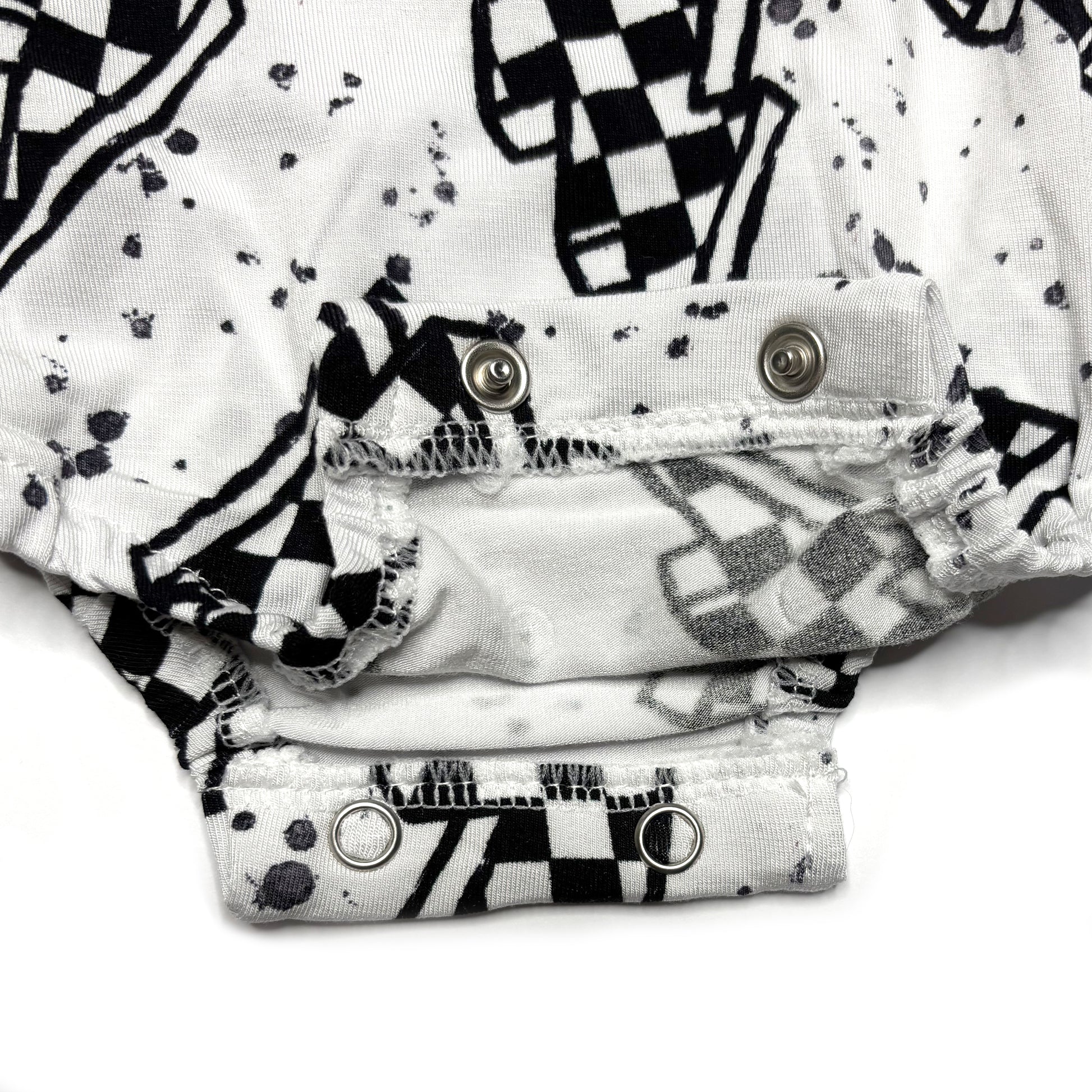 This one’s got serious attitude! The Thunder Pop bodysuit features high-contrast lightning bolts with checkered flair and splatter details that give it an edgy, rock-inspired look. Made from buttery-soft bamboo, it’s breathable, stretchy, and gentle on sensitive skin — perfect for cool babies with big energy. Snaps at the bottom make changes quick and easy.