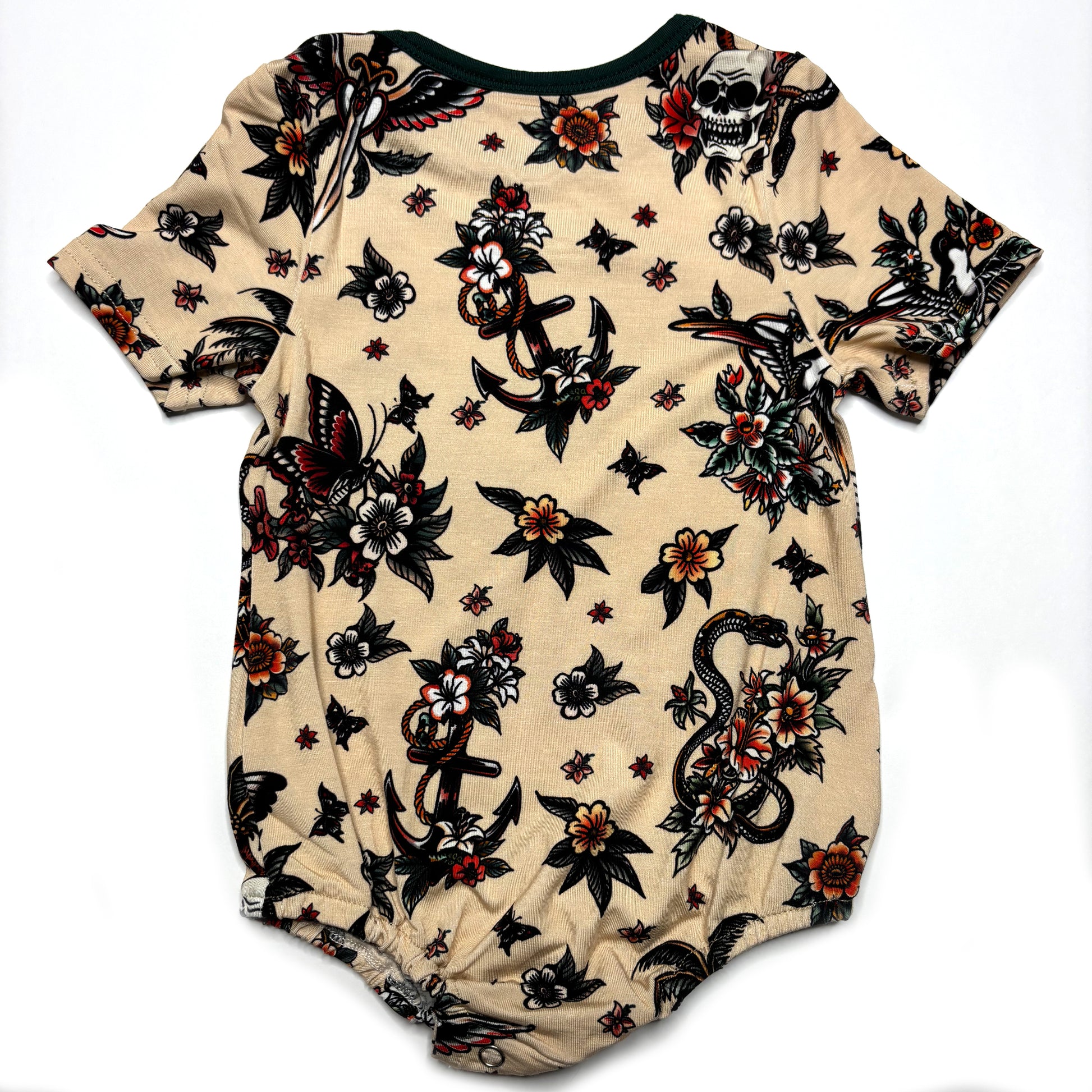 Bring the edge with our Wild Rebel bodysuit — inspired by classic tattoo flash sheets and bold enough for your littlest rockstar. Featuring anchors, skulls, snakes, and florals, this design pops on a warm neutral base. Crafted from breathable, silky-soft bamboo, it’s made to keep your little one comfy while turning heads. Snap closures at the bottom make changes quick and stress-free.